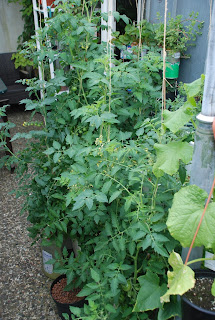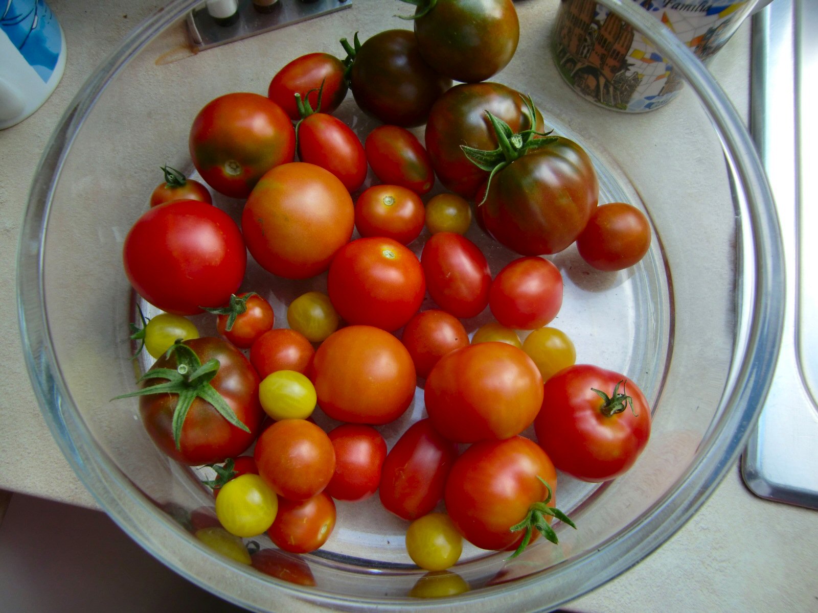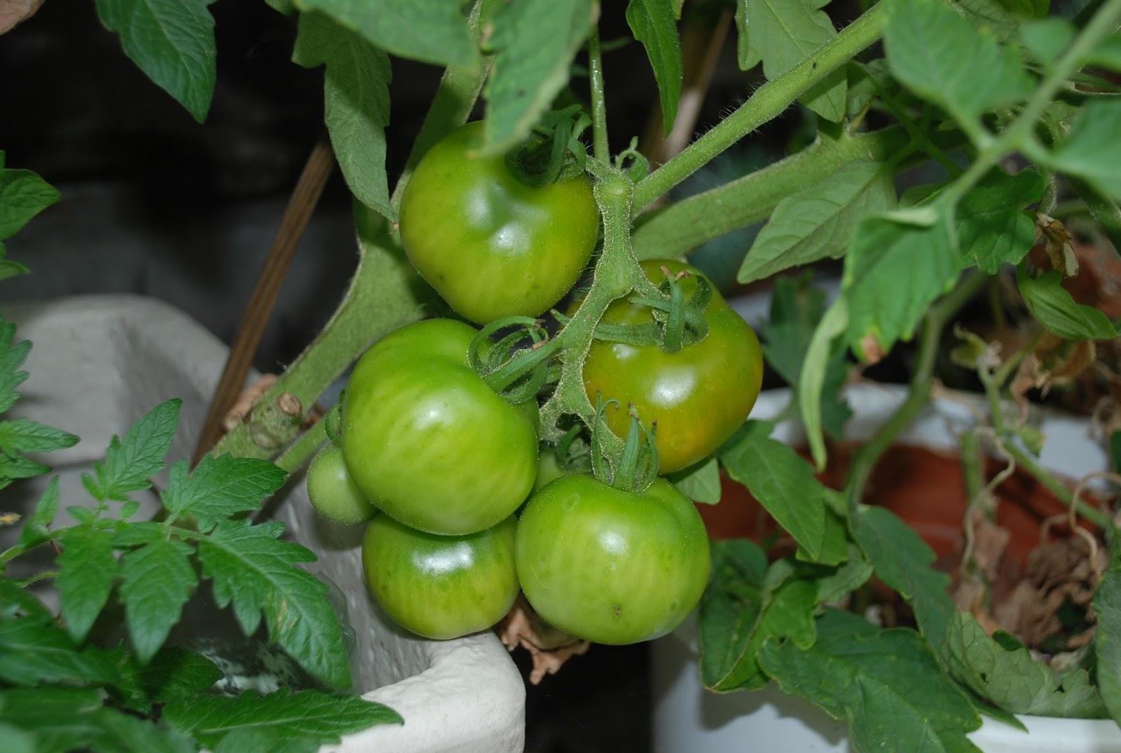 Die Tomaten sind wieder in Hydrokultur gepflanzt und freuen sich über das warme Wetter. Sie blühen wie verrückt und hängen voll grüner Früchte.