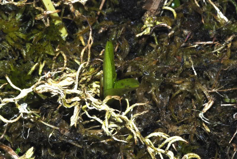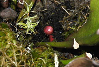 Auch die erste Schlauchpflanze (Sarracenia purpurea) zeigt neues Leben und schiebt eine Blütenknospe aus dem Boden.