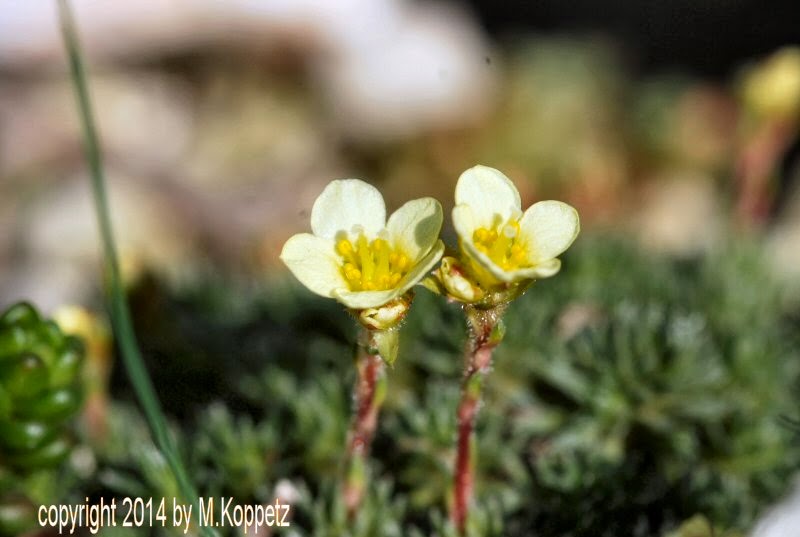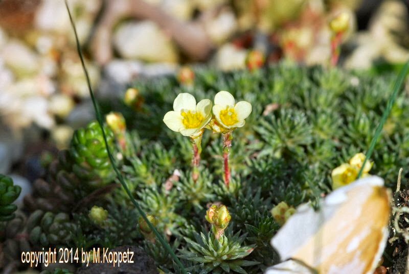 Die ersten Blüher bei den Sukkulenten und Alpinen ist der Moos-Steinbrech (Saxifraga juniperifloia)